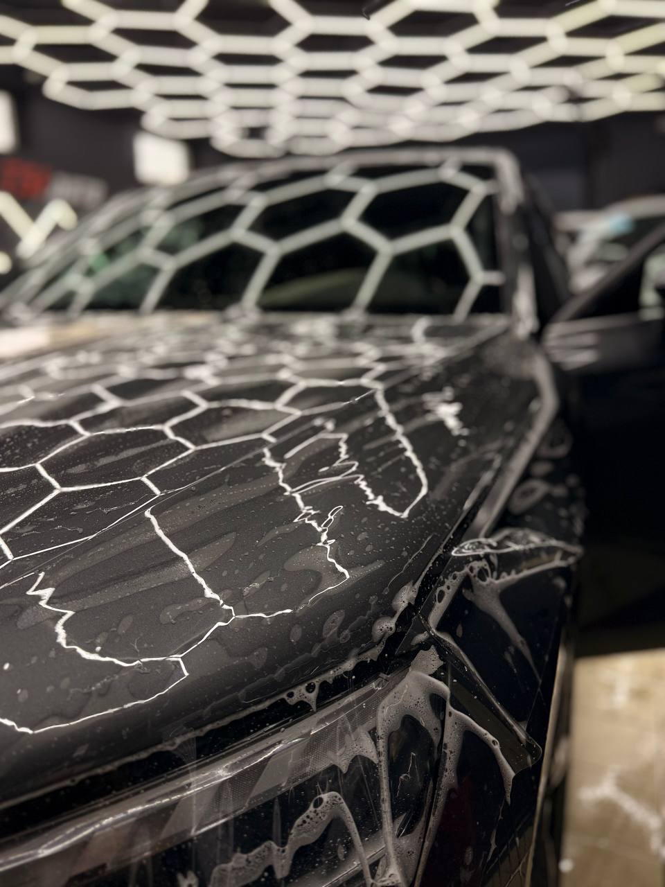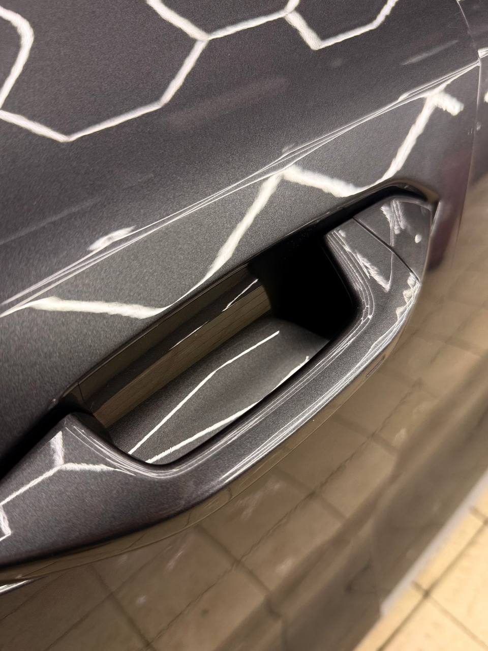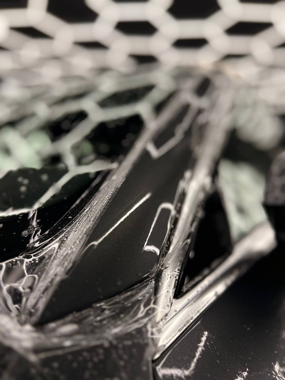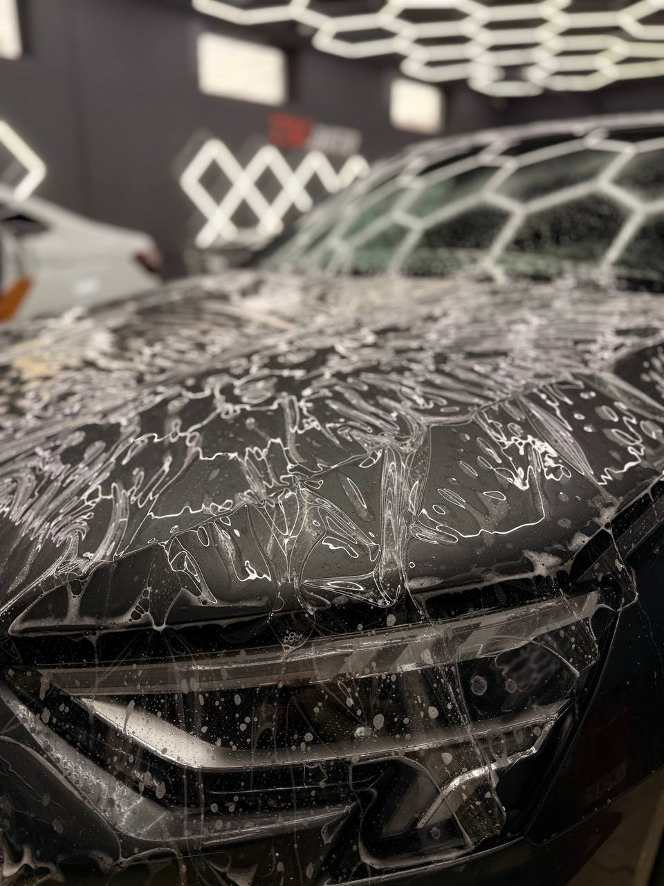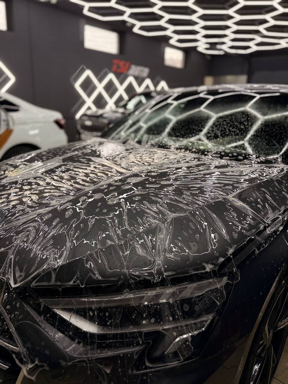 Далее не о процессе, а о конечном результате который получается на данном авто. Автомобиль будет меньше пачкаться, пленка обладает высоким гидрофобным эффектом и грязь не будет задерживаться на кузове. Ну и самое главное это защита, каждый оклеенный элемент выполнен с подворотом пленки по периметру. Сколы и царапины больше не угрожают ЛКП данного автомобиля, и если вдруг произойдет неприятная ситуация с мелким ДТП к примеру во дворе, с большей долей вероятности этот вопрос решиться заменой пленки на отдельном элементе. Так же автомобиль обрел на долго гарантированный блеск, так как пленка имеет самозаживляющий эффект и мелкие риски и царапинки будут затягиваться под воздействием температуры.