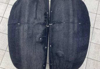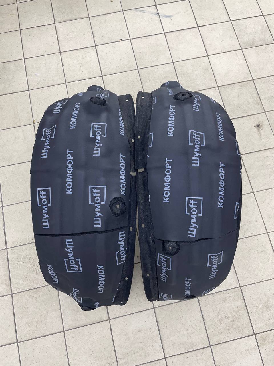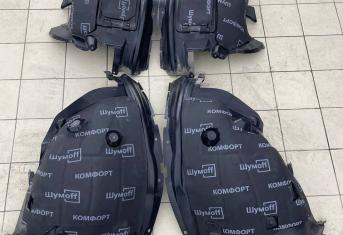 Передние подкрылки в авто пластиковые, предварительно очистив, мы монтируем виброизоляцию Шумофф Space 2.0 и шумоизоляцию Шумофф Комфорт 6. Задние войлочные, их грунтуем аэрозольным клеем и монтируем шумоизоляцию Шумофф Комфорт 6.