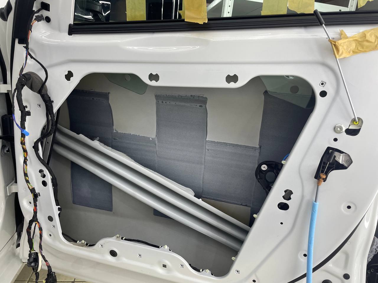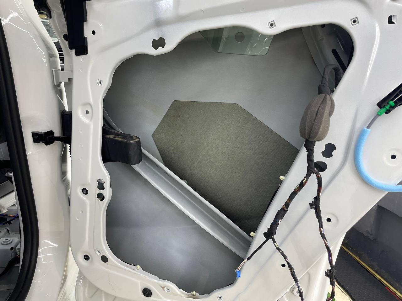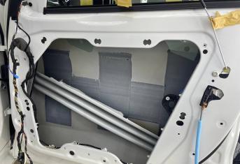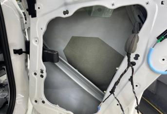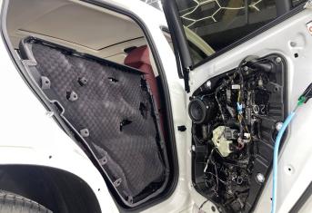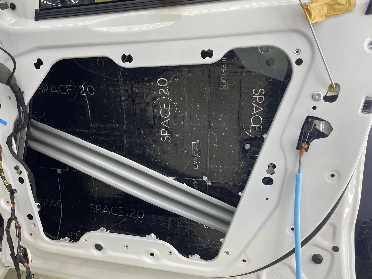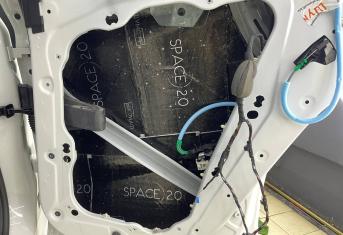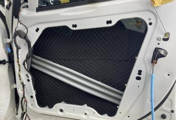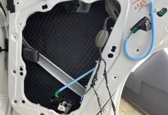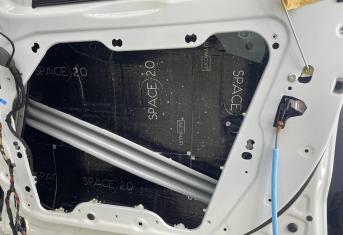 Третьим слоем применяем виброизоляцию Шумофф Space 2.0, это нам помогает создать максимальную жесткость второй стенки двери на которой расположен динамик. Саму обшивку двери оклеиваем локально виброизоляцией Шумофф Space 2.0 и полностью закрываем шумопоглощающим материалом Шумофф Герметон А15. Проводку на двери обрабатываем Шумофф Specific. По канту обшивки двери и клипсы обрабатываем Шумофф Absorber 5, чтобы избежать раздражительных звуков и не портить лакокрасочное покрытие.