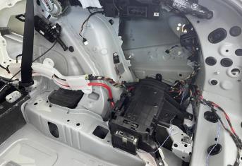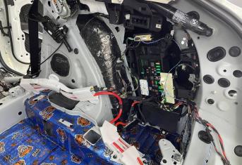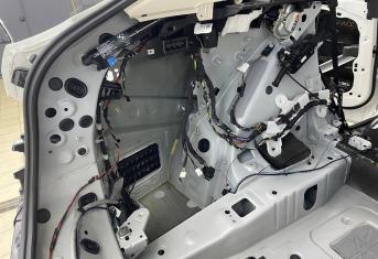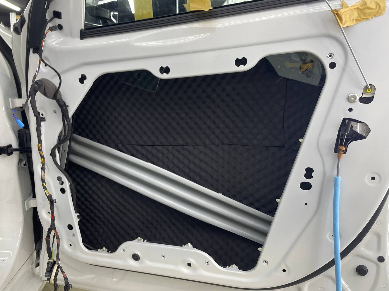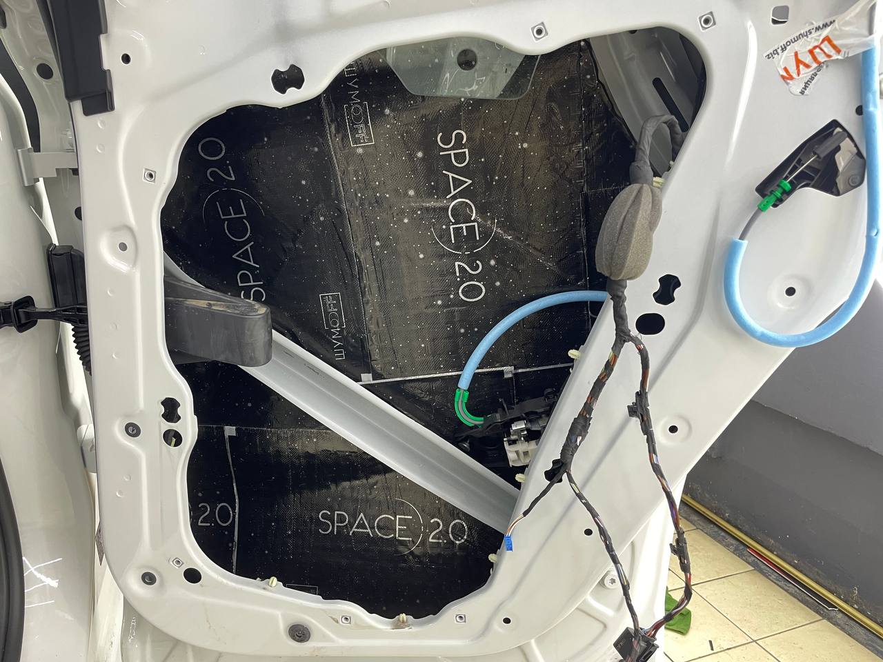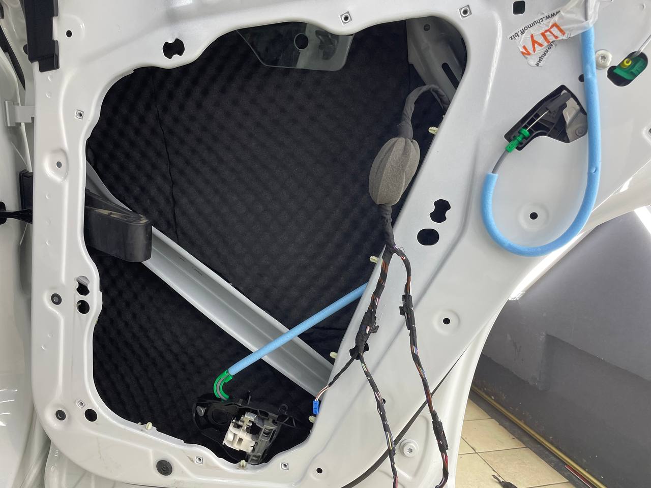 Третьим слоем применяем виброизоляцию Шумофф Space 2.0, это нам помогает создать максимальную жесткость второй стенки двери на которой расположен динамик. Саму обшивку двери оклеиваем локально виброизоляцией Шумофф Space 2.0 и полностью закрываем шумопоглощающим материалом Шумофф Герметон А15. Проводку на двери обрабатываем Шумофф Specific. По канту обшивки двери и клипсы обрабатываем Шумофф Absorber 5, чтобы избежать раздражительных звуков и не портить лакокрасочное покрытие.