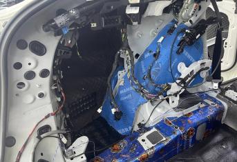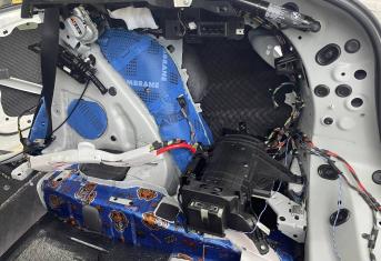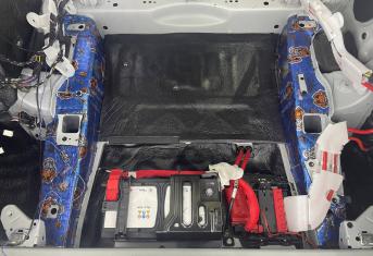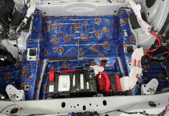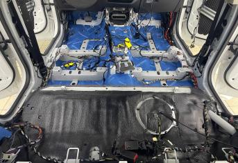 На первый слой по всему полу, от моторного щита до багажника используем Шумофф Space 5.0 – это премиальный многослойный вибродемпфер, включающий в себя прослойки мастики и битума. Эти составляющие позволяют ему эффективно работать в широком температурном диапазоне. Перед началом работ листы необходимо прогревать до 50 градусов, а затем приступать к монтажу и прикатке валиком. Пол в багажнике обрабатываем виброизоляцией Шумофф Super Jack - новый технологичный вибродемпфер от компании Шумофф, который имеет высокую каркасность и отлично гасит резонанс металла при движении. В задние крылья укладываем виброизоляцию Шумофф Space 2.0 и прикатываем с помощью валика на длинной ручке.