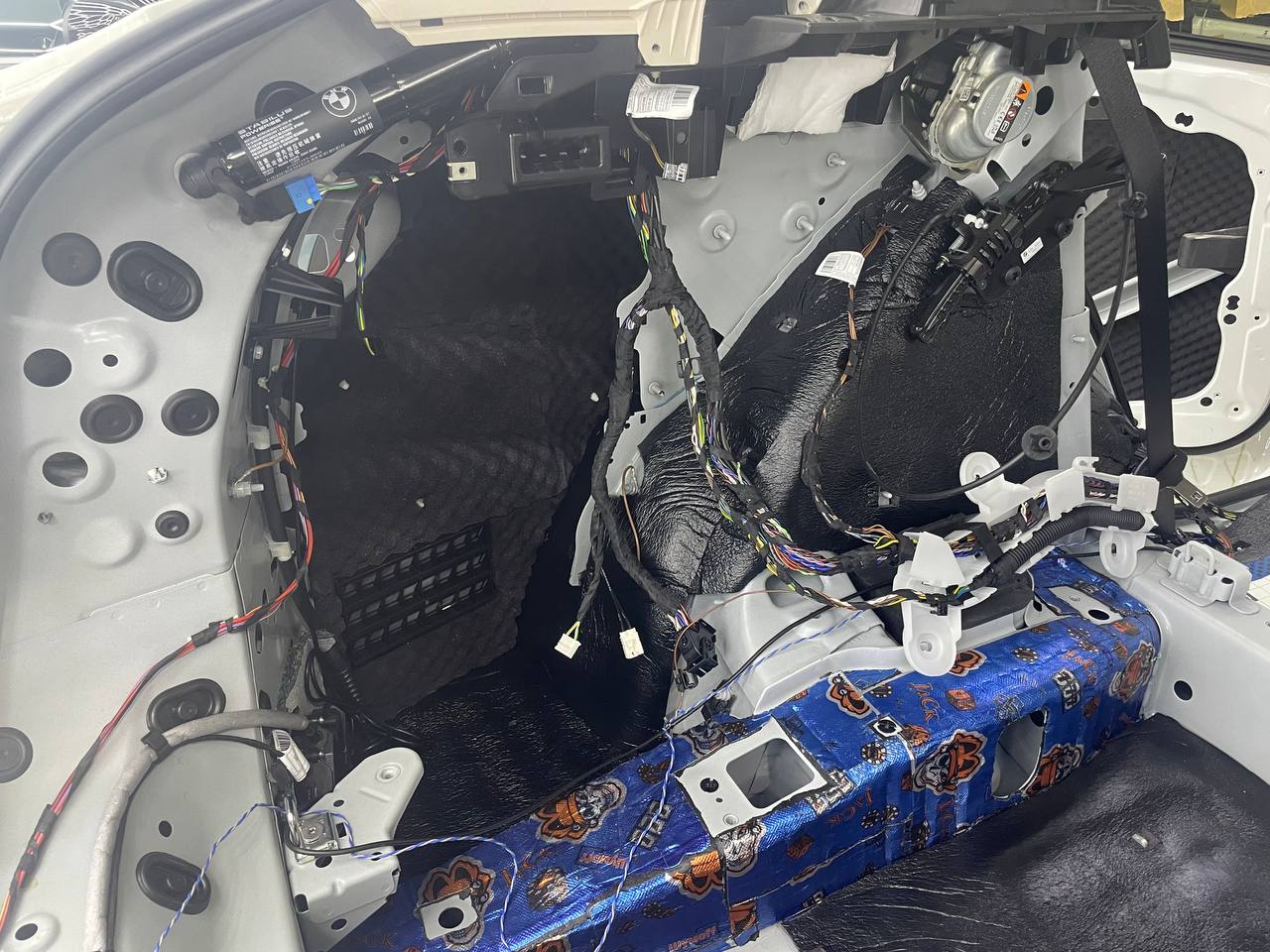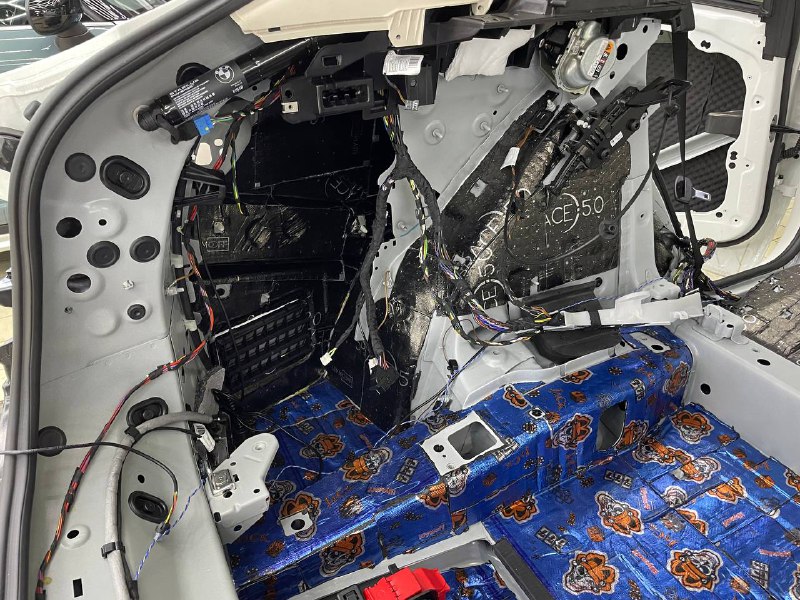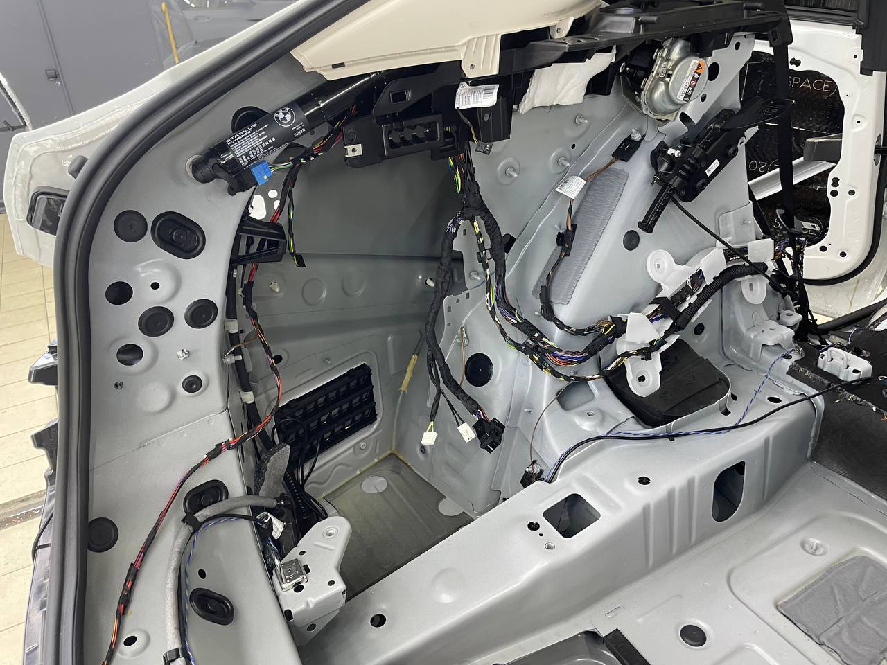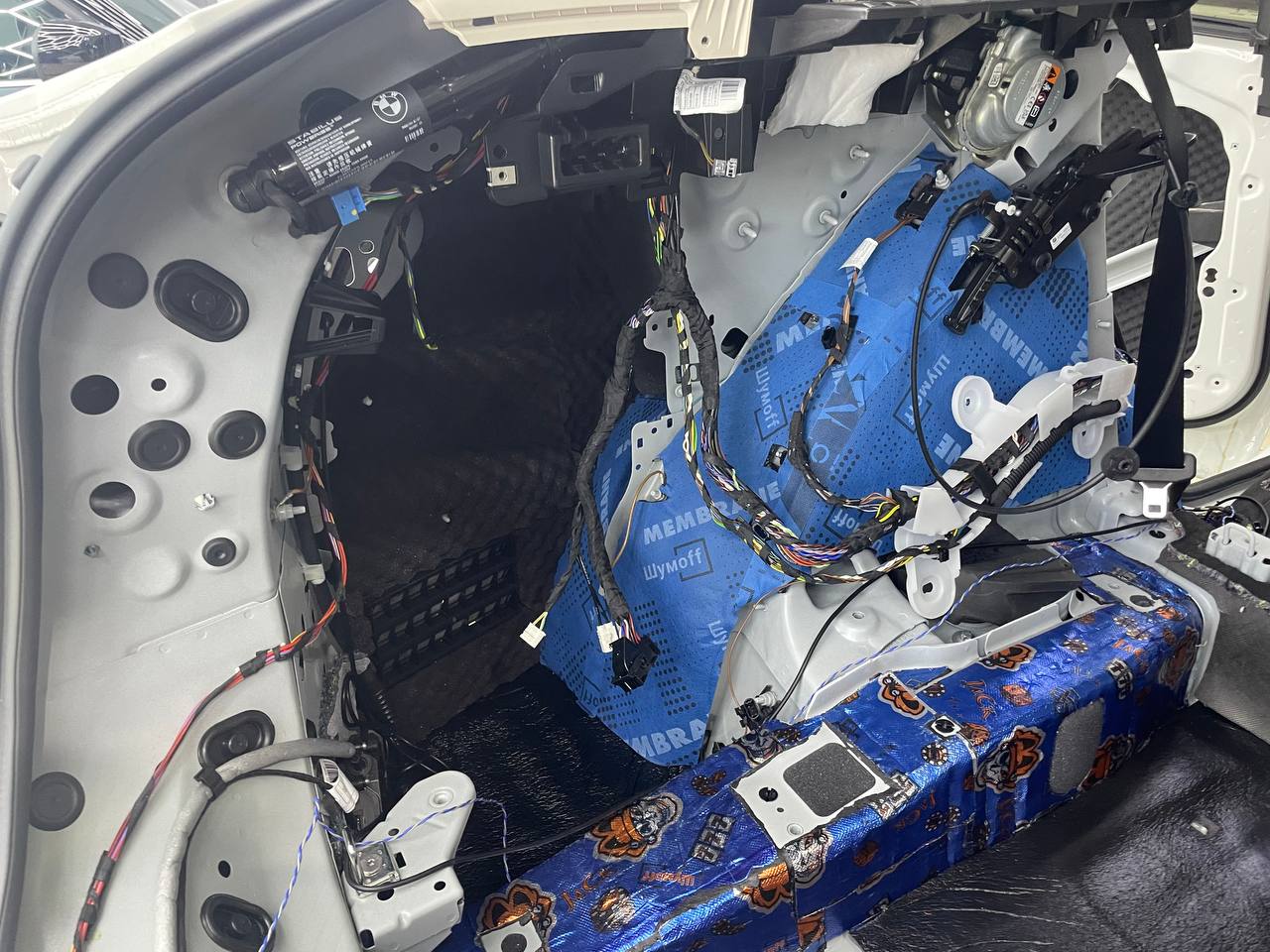 Изначально владелец авто жаловался на низкочастотный звук в салоне при движении. Штатная шумоизоляция BMW X4 состоит только из вибродемпфера. Напыляемую виброизоляцию можно увидеть на полу салона, в нише запасного колеса и дверях. Перед началом работ мы в обязательном порядке производим проверку качества монтажа заводского вибродемпфера с помощью специального инструмента. Смотрите фото салона после полного разбора ниже.