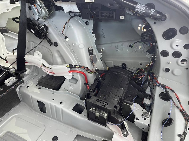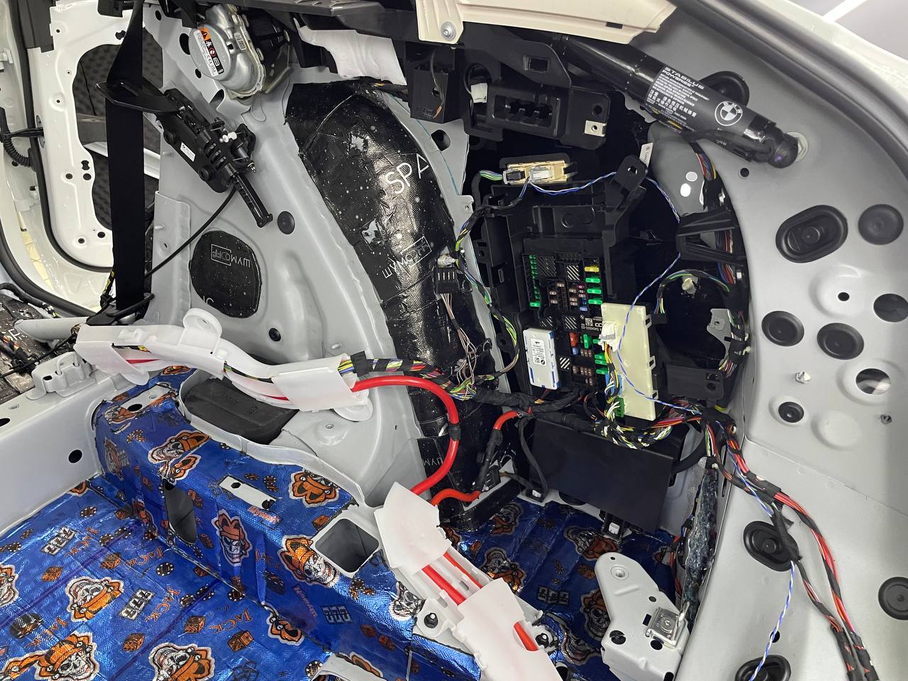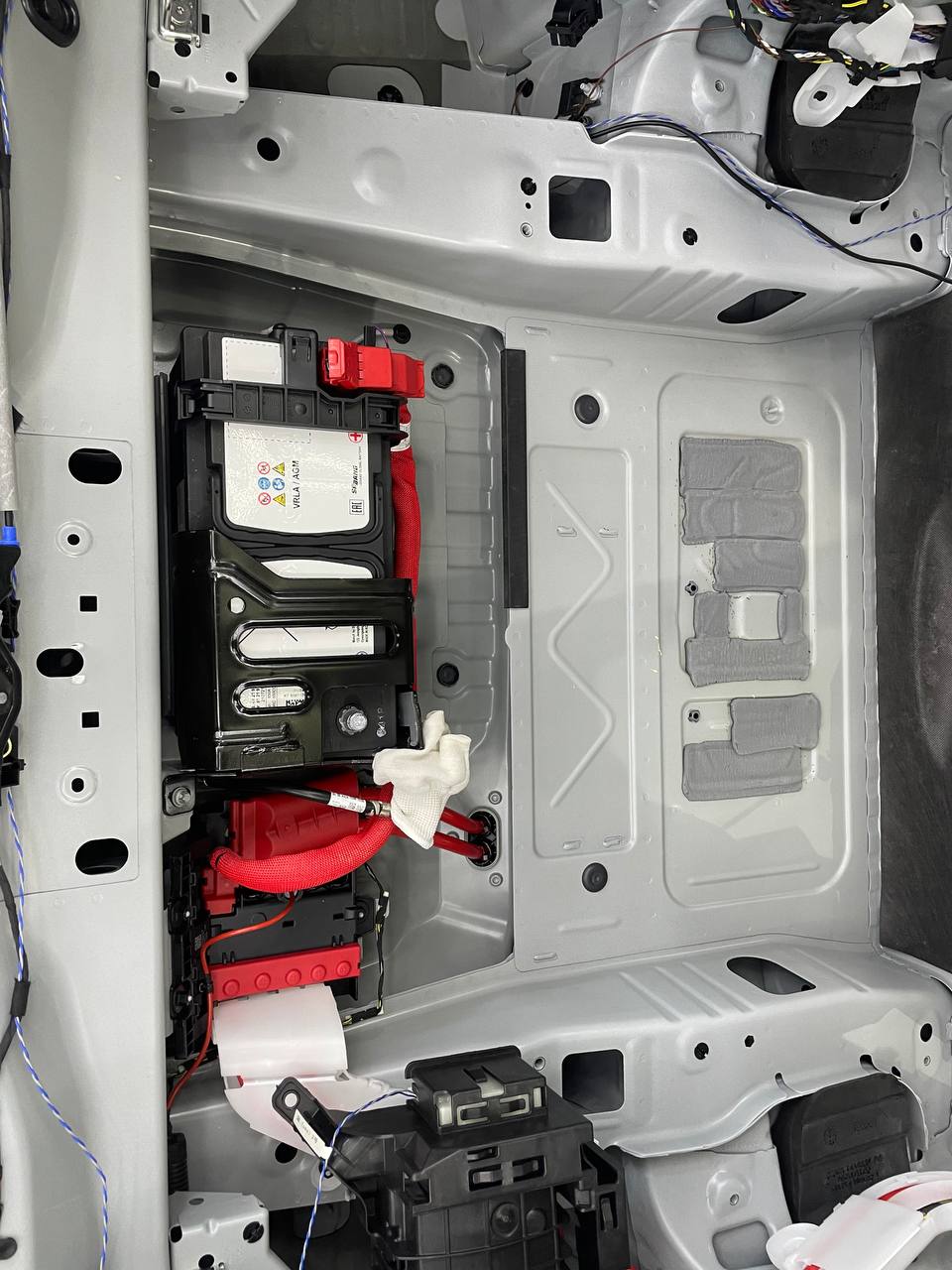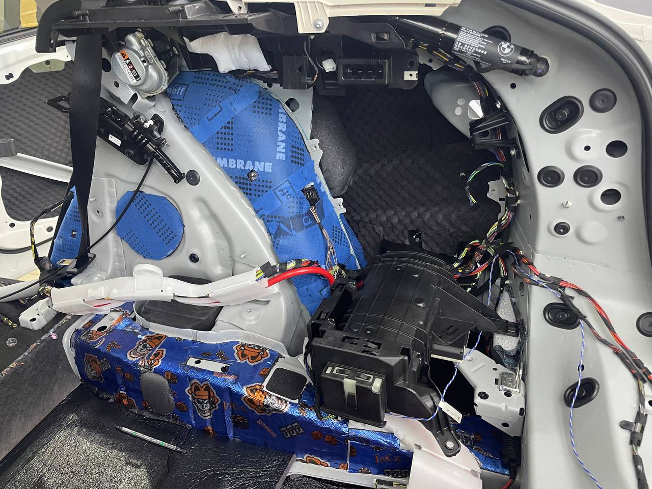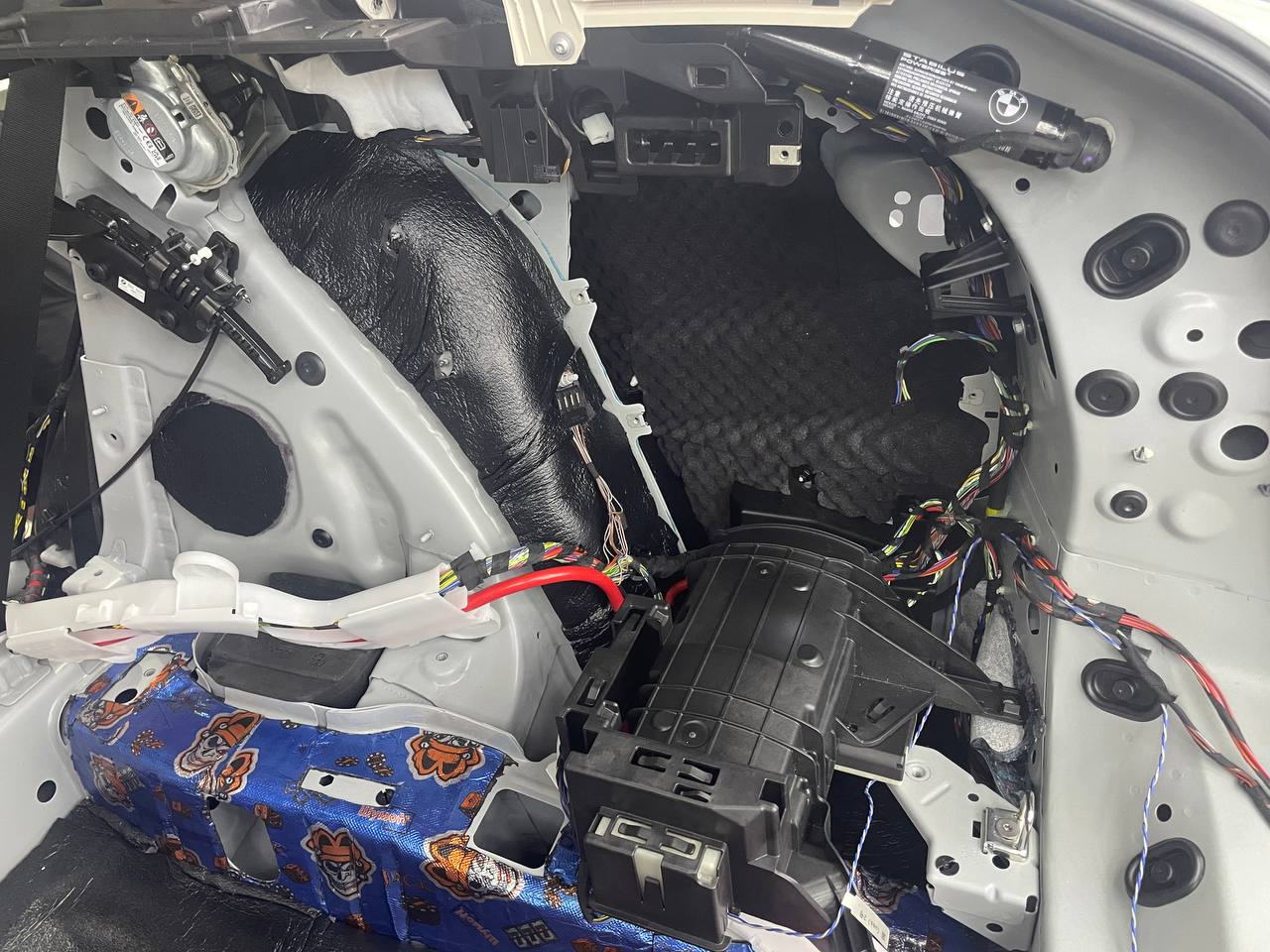 Изначально владелец авто жаловался на низкочастотный звук в салоне при движении. Штатная шумоизоляция BMW X4 состоит только из вибродемпфера. Напыляемую виброизоляцию можно увидеть на полу салона, в нише запасного колеса и дверях. Перед началом работ мы в обязательном порядке производим проверку качества монтажа заводского вибродемпфера с помощью специального инструмента. Смотрите фото салона после полного разбора ниже.
