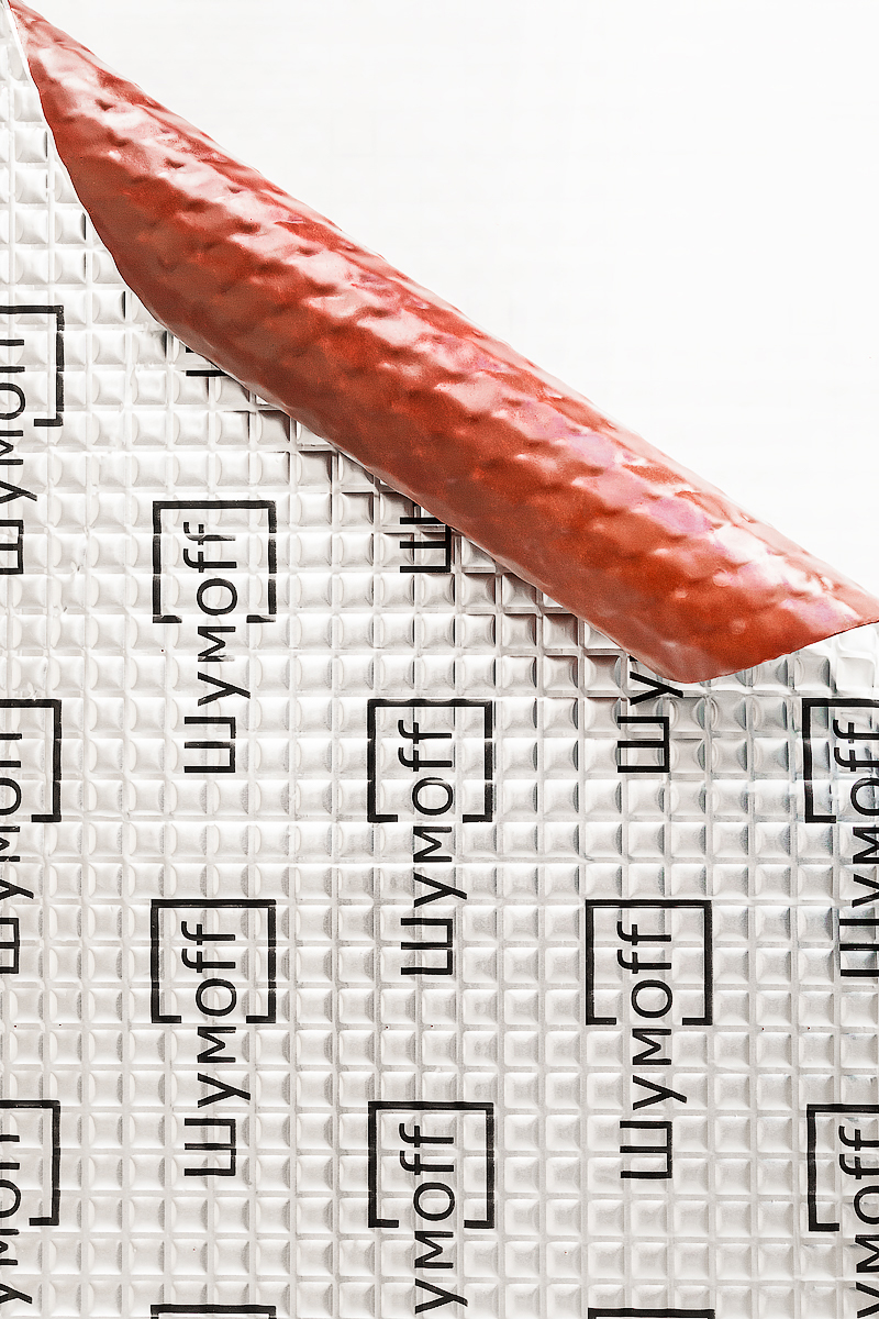 Мастичный слой защищен антиадгезионной бумагой, на которой присутствует логотип Шумоff и разметка, что обеспечивает защиту от подделок и упрощает раскрой материала.