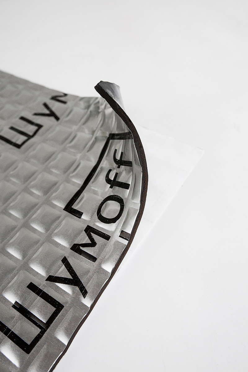 Монтажный слой защищен антиадгезионной бумагой, на которой присутствует логотип Шумоff и разметка, что обеспечивает защиту от подделок и упрощает раскрой материала.