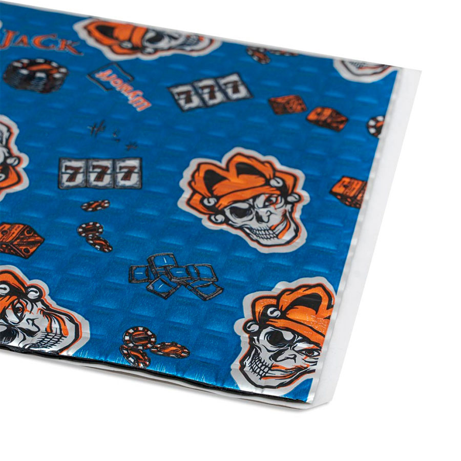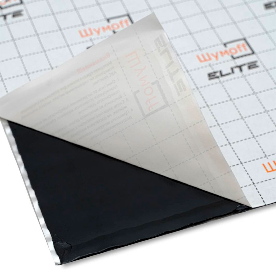 Мастичный слой защищен антиадгезионной бумагой, на которой присутствует логотип Шумоff и разметка, что обеспечивает защиту от подделок и упрощает раскрой материала.