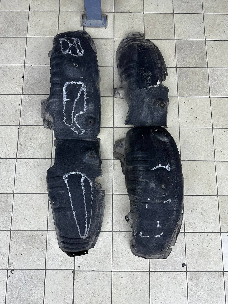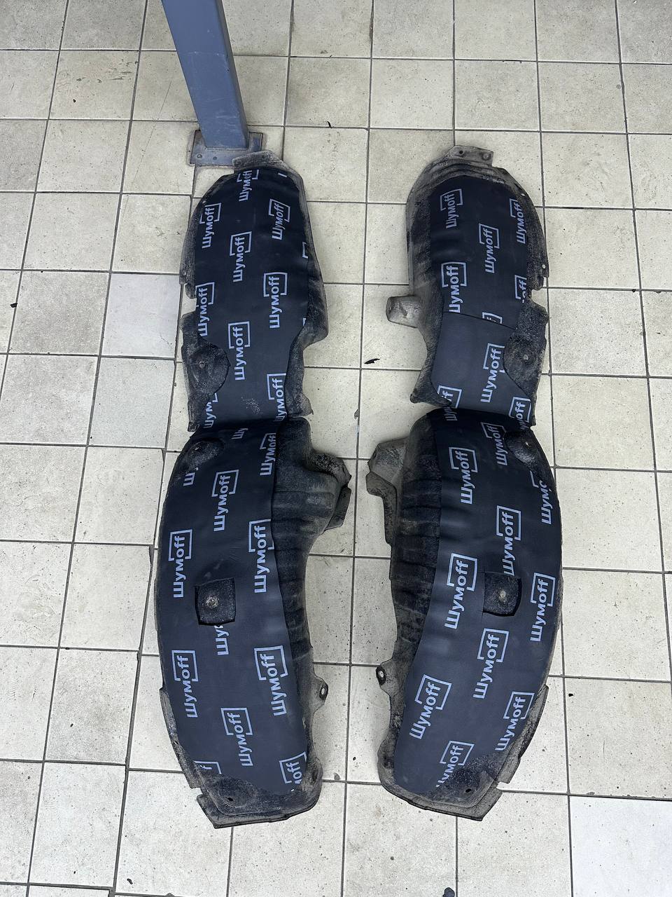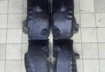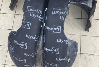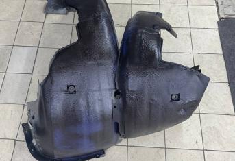 На металл передних арок, сторона к салону, и проем между кузовом и крылом наносим виброизоляцию Шумофф Super Jack. Это технологичный и эффективный вибродемпфер толщиной 3,6 мм с повышенным уровнем адгезии, что позволяет ему прекрасно работать в такой агрессивной среде как арки с улицы. Подкрылки пластиковые, на них мы монтируем локально виброизоляцию Шумофф Jack и шумоизолятор Шумофф Комфорт 6. Виброизоляция наносится с зазорами, чтобы сохранить гибкость локеров для дальнейшего обслуживания автомобиля. После монтажа материалов на подкрылок и кузов автомобиля все обработанные элементы заливаем жидким полимером. Так мы герметизируем швы и защищаем новые материалы от механических повреждений, после просыхания полимер обретает высокую прочность.