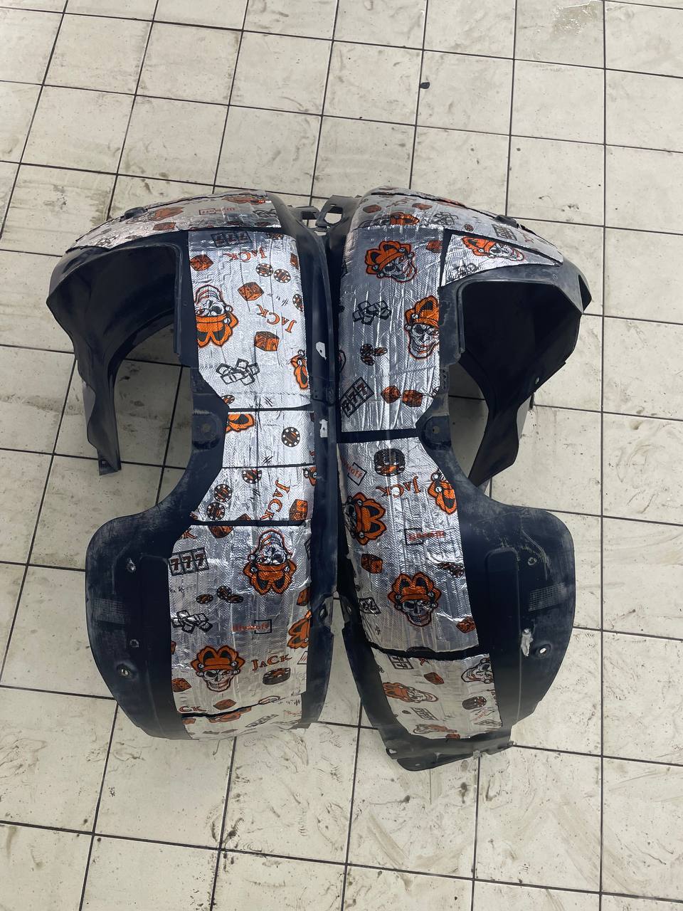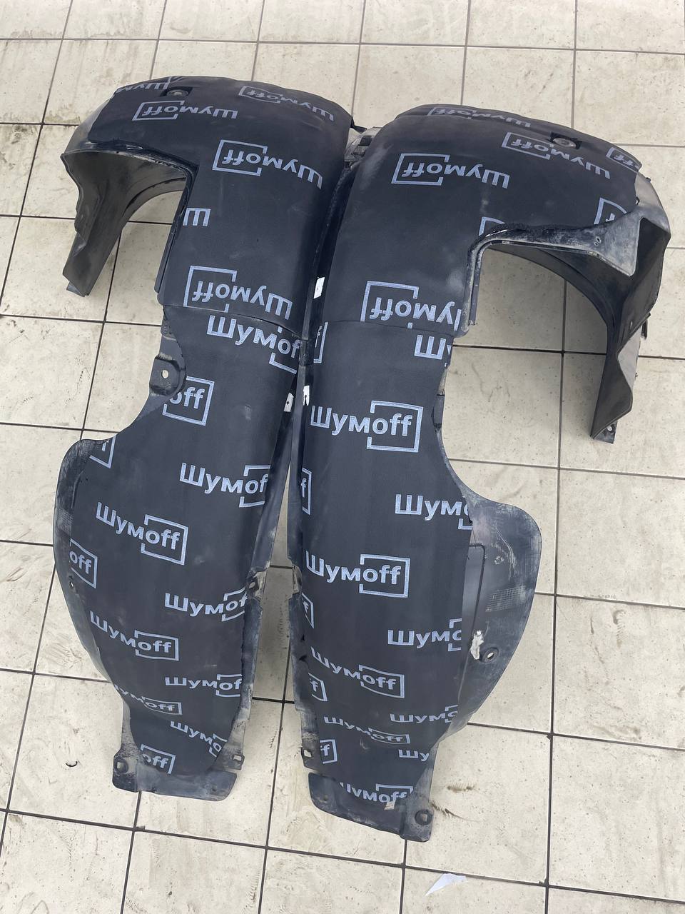 На задние арки монтируем виброизоляцию Шумофф Super Jack по всей поверхности металла и наносим жидкий полимер. Подкрылки здесь фетровые и виброизоляция попросту не будет держаться должным образом. Поэтому на них монтируется сразу Комфорт 6 и обрабатывается полимером.