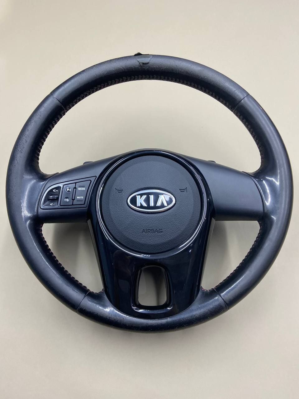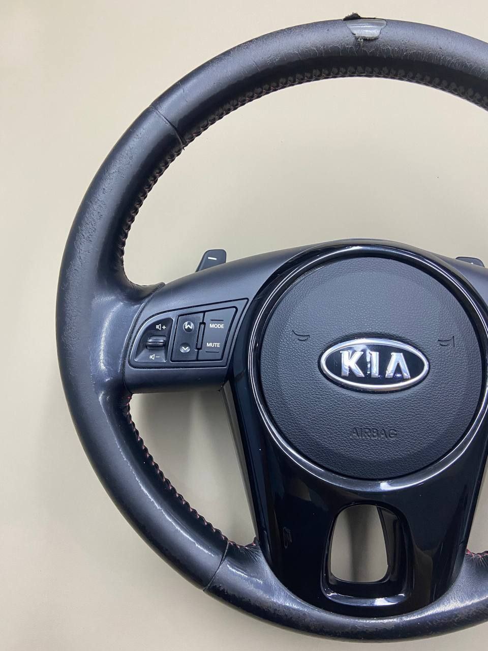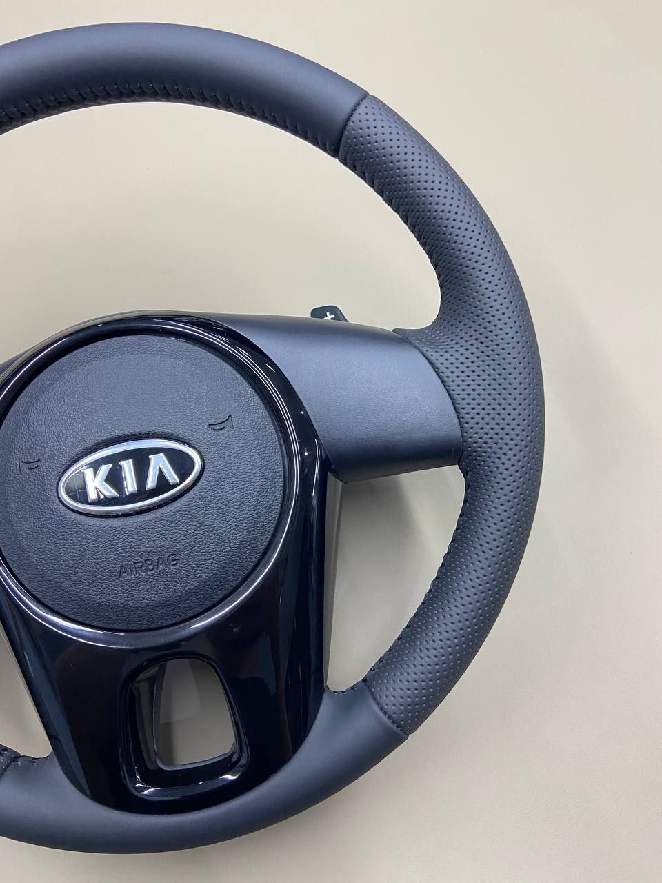 При перетяжке руля КИА Серато мы применили гладкую натуральную кожу и кожу с псевдо-перфорацией для создания более спортивного вида. Клиент заменил шов на «елочку» и заменили нити на черные. В итоге получился стильный и очень приятный на ощупь руль, который прослужит долгие годы при правильном уходе за ним. Кстати, плановую чистку кожаного руля, для сохранения на долгое время в первозданном виде, нужно проводить раз в 3-4 месяца и это тоже можно сделать у нас.