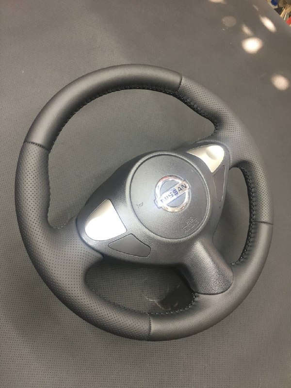 При перетяжки Ниссан Джук мы применили два вида текстуры кожи для повторения рисунка заводского руля, он был из пластика. Верхняя и нижняя части из текстурной кожи, бока с псведоперфорацией. Клиент выбрал шов «косичка» черными нитками. Руль хорошо лежит в руке и не проскальзывает при любых температурах.