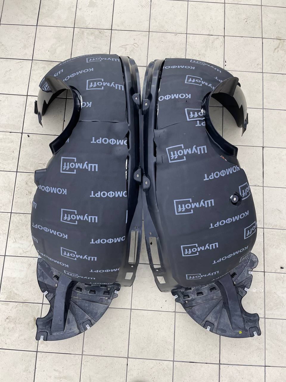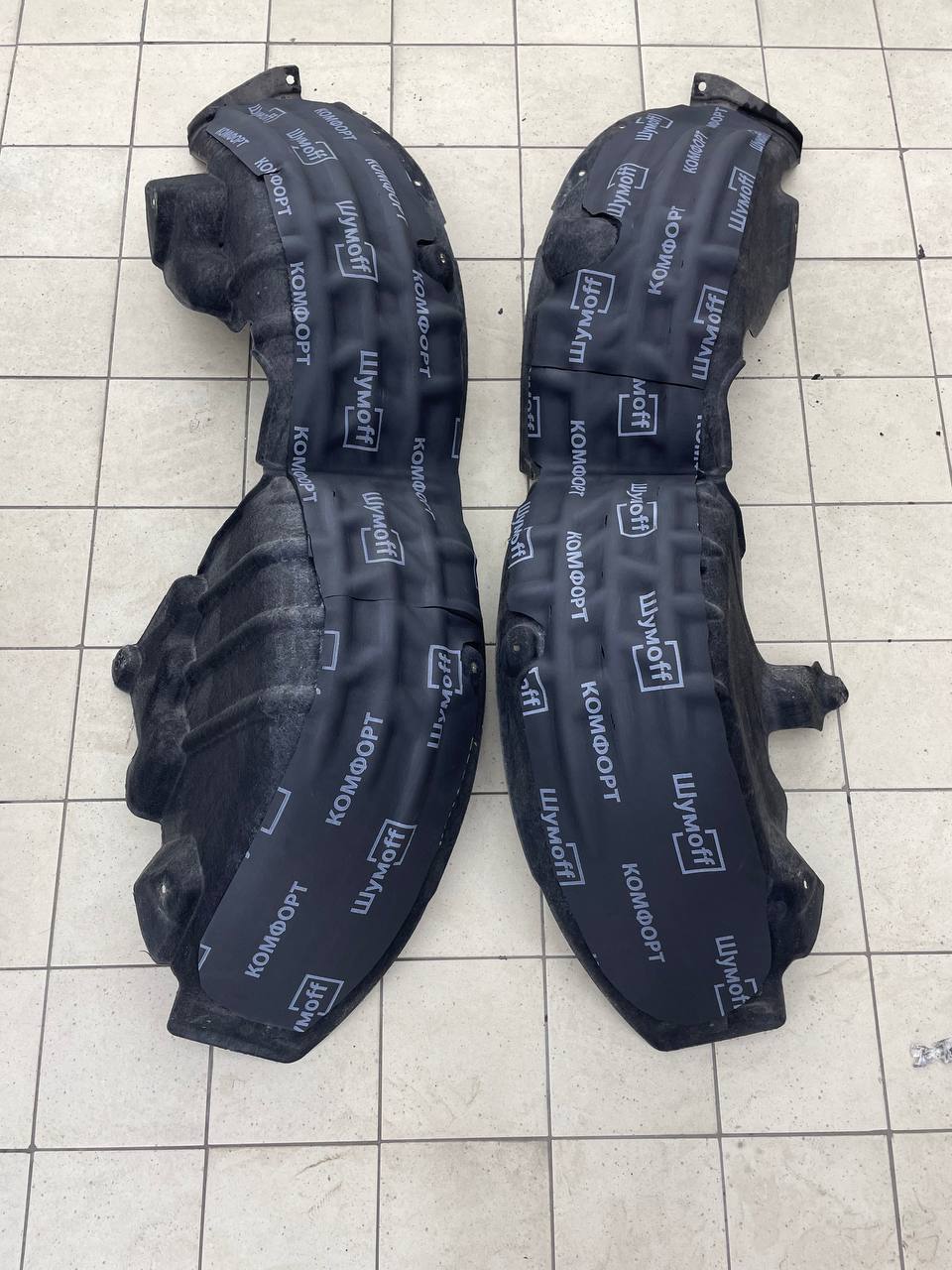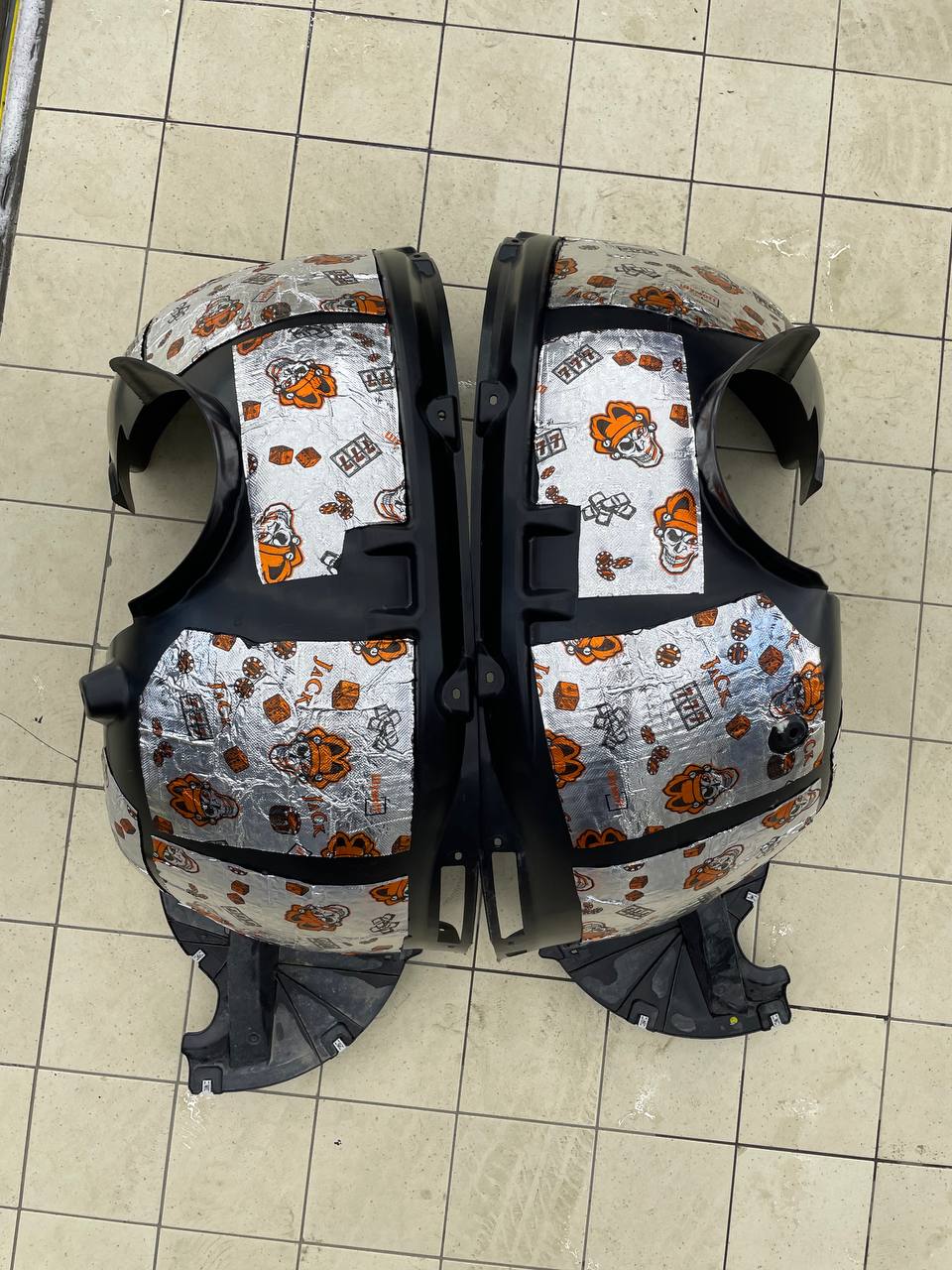 На металл передних арок, сторона к салону, и проем между кузовом и крылом наносим виброизоляцию Шумофф Super Jack. Это технологичный и эффективный вибродемпфер толщиной 3.6 мм с повышенным уровнем адгезии, что позволяет ему прекрасно работать в такой агрессивной среде как арки. Передние подкрылки пластиковые, монтируем первым слоем Шумофф Jack, затем Комфорт 6 и заливаем жидким полимером.